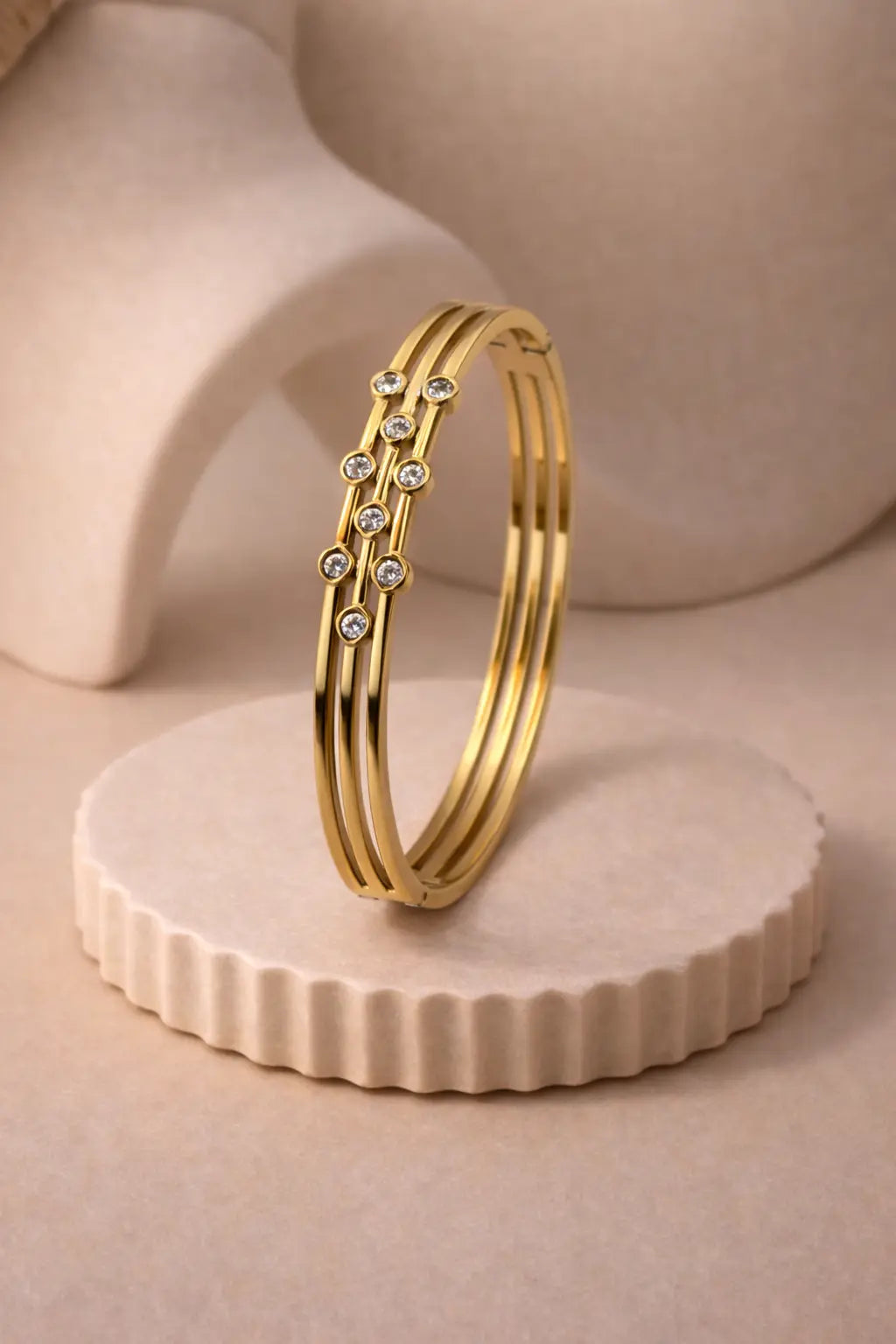 A refined three-line gold cuff accented with delicate crystal details, designed for understated sparkle and modern elegance. Perfect for elevating everyday looks with a touch of quiet luxury.